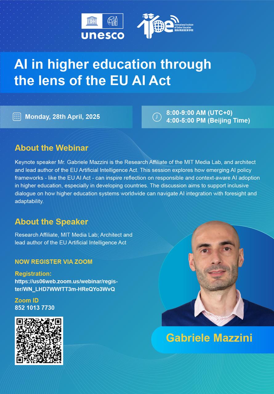 With the rapid development of Artificial Intelligence, how to realize the responsible use of AI in higher education has become a hot topic of global concern. At this webinar, titled AI in Higher Education Through the Lens of the EU AI Act, the International Institute of Online Education (IIOE) is honored to invite Mr. Gabriele Mazzini, the Architect and lead author of the EU Artificial Intelligence Act and a global leader in AI governance, to discuss how to effective and responsible integration of AI in higher education.