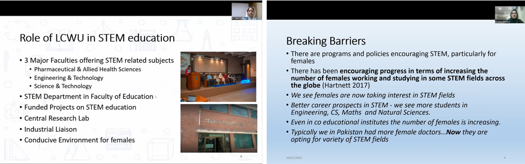 该网络研讨会分为两部分:1) STEM领域女性领导者故事分享 (Storytelling);2) 拉合尔女子大学作为南亚领先的女子高等教育机构展示STEM人才培养实践案例 (Case-study Presentation)。本次研讨会邀请到了北京师范大学中国民族教育与多元文化研究中心副主任张莉莉教授致开幕词,并概述女性在STEM领域所面临的发展和挑战,以及中国高校、组织和个人对支持女性所作出的努力。