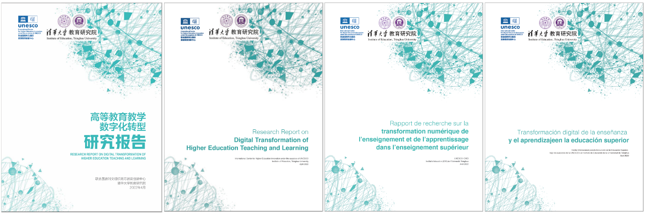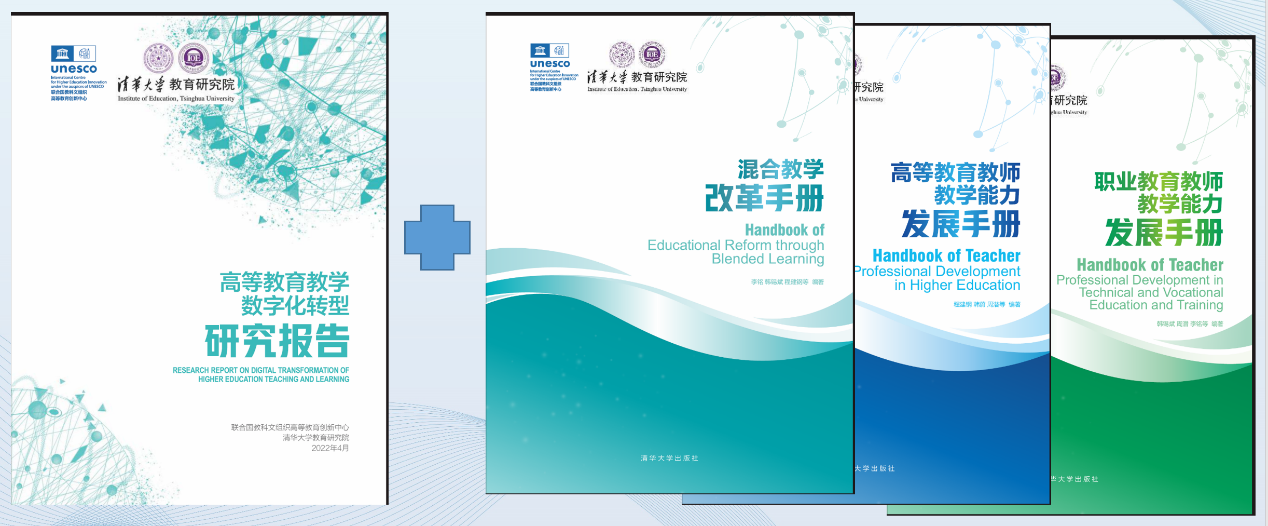 2022年5月20日由联合国教科文组织高等教育创新中心与清华大学教育研究院联合开展的“高等教育数字化转型”系列研究成果(“3+1”项目,即3本手册和1份研究报告)在第三届联合国教科文组织世界高等教育大会面向全球正式发布。研究项目由李铭教授、程建钢教授和韩锡斌教授共同领导,携手组织国内外50多位专家学者开展联合研究,凝聚了过去十多年混合教学和教师数字化教学能力发展方面的研究成果,为全球高等教育和职业教育贡献中国智慧,助力联合国教科文组织2030教育可持续发展目标的实现。