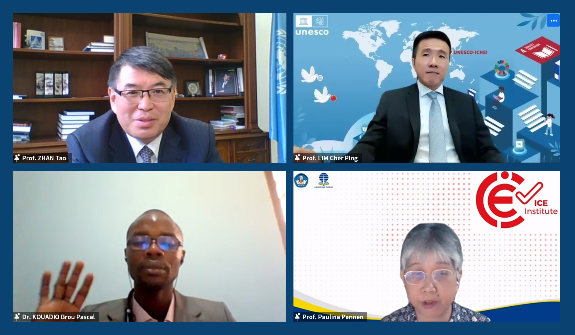 联合国教科文组织教育信息技术研究所主任展涛先生主持了以“未来教师数字化转型的挑战与应对”为主题的国际案例研讨环节。在这一环节中,国际网络教育学院(IIOE)首席专家、香港教育大学学习技术与创新讲席教授,教育及人类发展学院副院长(国际交流)林质彬教授、科特迪瓦虚拟大学助理教授 Kouadio Brou Pascal 博士、印尼网络教育研究院院长 Paulina Pannen 教授分别就国际组织、非洲及亚洲国家高等教育机构有关教师数字化转型的实践经验、支持教师数字化能力建设的方式方法,以及在此过程中所面对的挑战进行了分享。