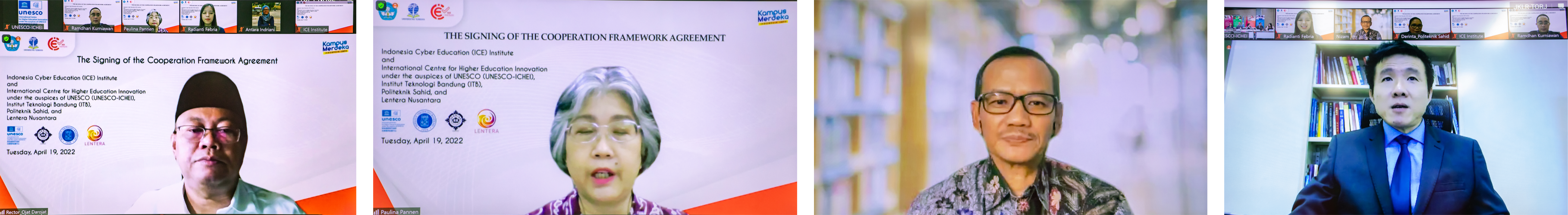 2022年4月19日上午,在印尼驻教科文常驻团副代表Ismunandar大使、印尼教科文全委会主席Itje Chodidjah博士的见证下,联合国教科文组织高等教育创新中心(中国深圳)(下称 “创新中心”)与印尼教育文化研究和技术部高等教育研究技术司、印尼网络教育研究院正式签署国际网络教育学院(International Institute of Online Education, 简称IIOE)协议,在印尼设立IIOE国家中心。与此同时,印尼万隆理工学院、萨希德职业技术学院、“Lentera Nusantara”学习平台分别与印尼IIOE国家中心签订协议,共同建设IIOE优质在线教育资源。新冠疫情爆发以来,印尼全国4500所高等教育机构都面临长期开展在线学习的挑战。由此,印尼政府发起了设立印尼网络教育研究院的国家级举措,协调和调动全国高等教育资源,帮助本国高等教育在疫情期间实施在线学习、为在线教育的新常态提供支持、为国家提供政策建议。 印尼网络教育研究院院长Paulina Pannen教授发言指出,印尼网络教育研究院在教育部的支持下集成了本国的优质在线高等教育资源,重视伙伴关系并形成