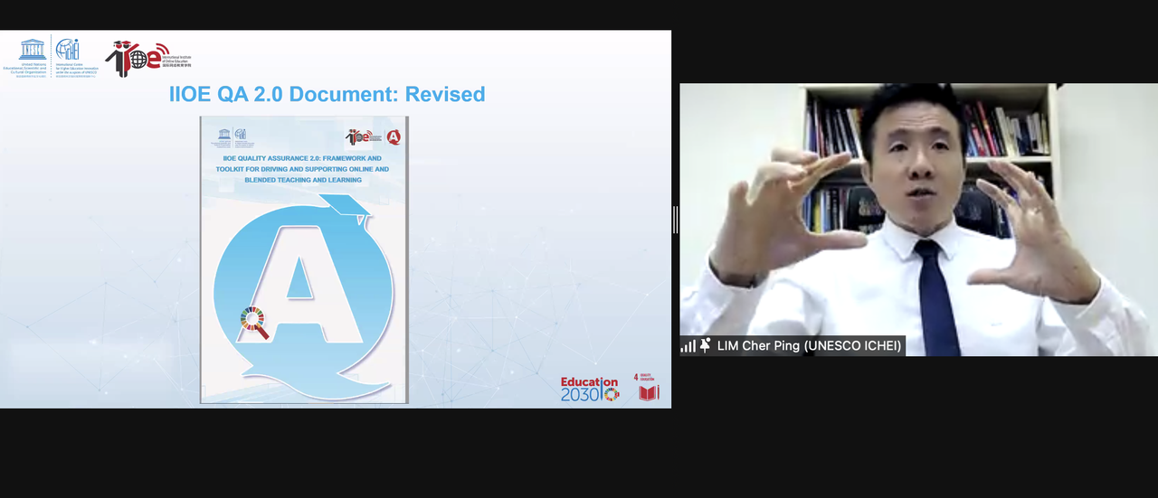 2021年10月28日, 国际网络教育学院(International Institute of Online Education, IIOE)质量保障2.0咨询会议成功召开。此次会议由联合国教科文组织高等教育创新中心(中国深圳)(以下简称“创新中心”)主办。 本次咨询会议围绕“利用IIOE质量保障2.0:发挥在线及混合教育的潜力促进优质和全纳高等教育”的主题展开,与IIOE合作高校、国际专家就IIOE质量保障2.0进行了磋商,形成了对IIOE质量保障2.0更新版本的初步共识。 现场参会嘉宾合影 线上参会嘉宾合影 来自西亚非洲地区21个国家的24个伙伴高校的代表、质量保障专家、联合国教科文组织代表等共计80余人参加了本次会议。创新中心IIOE运营中心主任吕锋先生致开幕词。他介绍了IIOE的总体规划,并指出本次会议的目的在于征询IIOE伙伴院校和国际专家对IIOE质量保障2.0的反馈,并明确下一步行动。 创新中心IIOE运营中心主任吕锋先生致开幕词 IIOE首席专家,香港教育大学讲席教授林质彬教授介绍了IIOE质量保障2.0的框架、工具包和实施机制。林教授表示,创新中心在2019年1
