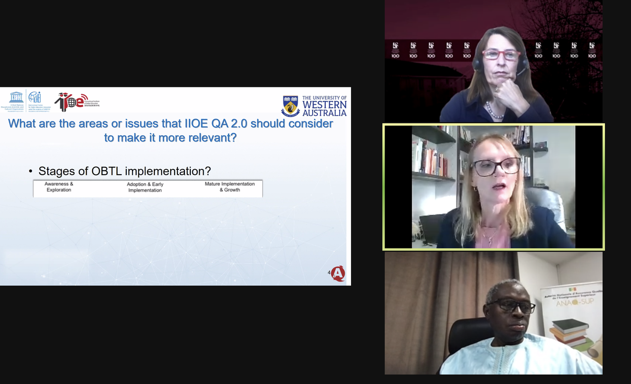 质量保障领域的国际专家对IIOE质量保障2.0的更新版本进行了商议,并提出了建议。专家讨论由斯泰伦博斯大学教学提升主任Antoinette van der Merwe博士主持,西澳大利亚大学助理教授Grace Oakley女士和塞内加尔质量保证局秘书长Lamine Gueye教授讨论了如何利用IIOE质量保障2.0支持伙伴院校,从而提升在线混合式教育的质量。Grace Oakley表示IIOE质量保障2.0十分全面灵活,在后续更新中可以考虑融入更多来自发展中国家的视角和案例研究,以增强其在发展中国家的可操作性,真正达到保障和提升教育质量的目的。Lamine Gueye教授介绍了塞内加尔的高校在疫情背景下开展在线与混合教学的情况,强调了IIOE质量保障2.0框架在对提升本国在线混合式高等教育质量有重要参考价值,并且表示塞内加尔质量保证局可以携手创新中心共同推进质量保障2.0的实施。