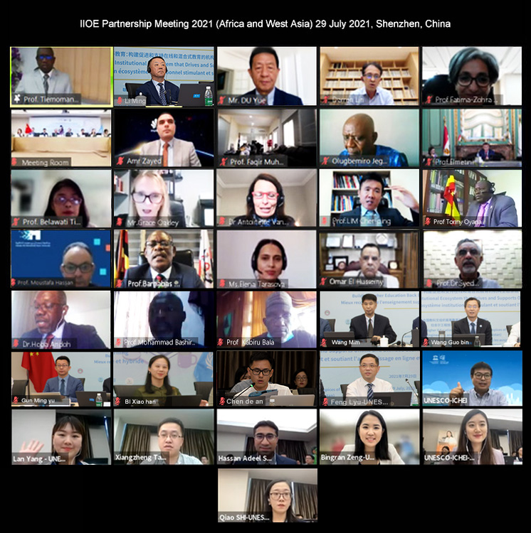 2021年7月29日,2021年国际网络教育学院(International Institute of Online Education, IIOE)合作伙伴会议(西亚非洲)成功召开。此次会议由联合国教科文组织高等教育创新中心(中国深圳)(以下简称“创新中心”)主办,IIOE2021年轮值主席单位拉合尔工程技术大学(巴基斯坦)联合组织。 会议围绕“更好地重塑高等教育:构建促进和支持在线混合式教育的机构生态系统”的主题展开,讨论了IIOE未来发展的关键问题,分享IIOE在西亚非洲地区的伙伴院校在疫情和后疫情时代为确保高等教育连续性和质量而采取的行动和积累的经验,以及IIOE支持西亚非洲地区伙伴院校开展在线混合式教学、实现数字化转型的优秀案例,并讨论如何利用IIOE质量保障 2.0充分发挥高等院校开展在线混合式教育的潜力。 现场参会嘉宾合影 线上参会嘉宾合影 来自西亚非洲地区逾20个国家的伙伴高校代表、政府代表、联合国教科文组织代表、教师、专家,以及国内合作企业代表共计100余人参加了本次会议。IIOE 2021年轮值主席单位拉合尔工程技术大学(巴基斯坦)校长Syed Mansoor S