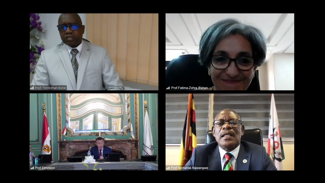 埃及的艾因·夏姆斯大学校长Mahmoud El-Meteini教授、摩洛哥的卡迪·艾雅德大学副校长Fatima-Zohra Iflahen教授、乌干达的马克雷雷大学校长Barnabas Nawangwe教授、科特迪瓦的科特迪瓦虚拟大学校长Tiemoman Kone教授分享了各自院校在新冠疫情背景下开展在线混合式教学、提高师生信息通信能力的经验和优秀实践。他们还高度肯定了IIOE在提升本校在线混合式高等教育能力方面发挥的重要作用。
