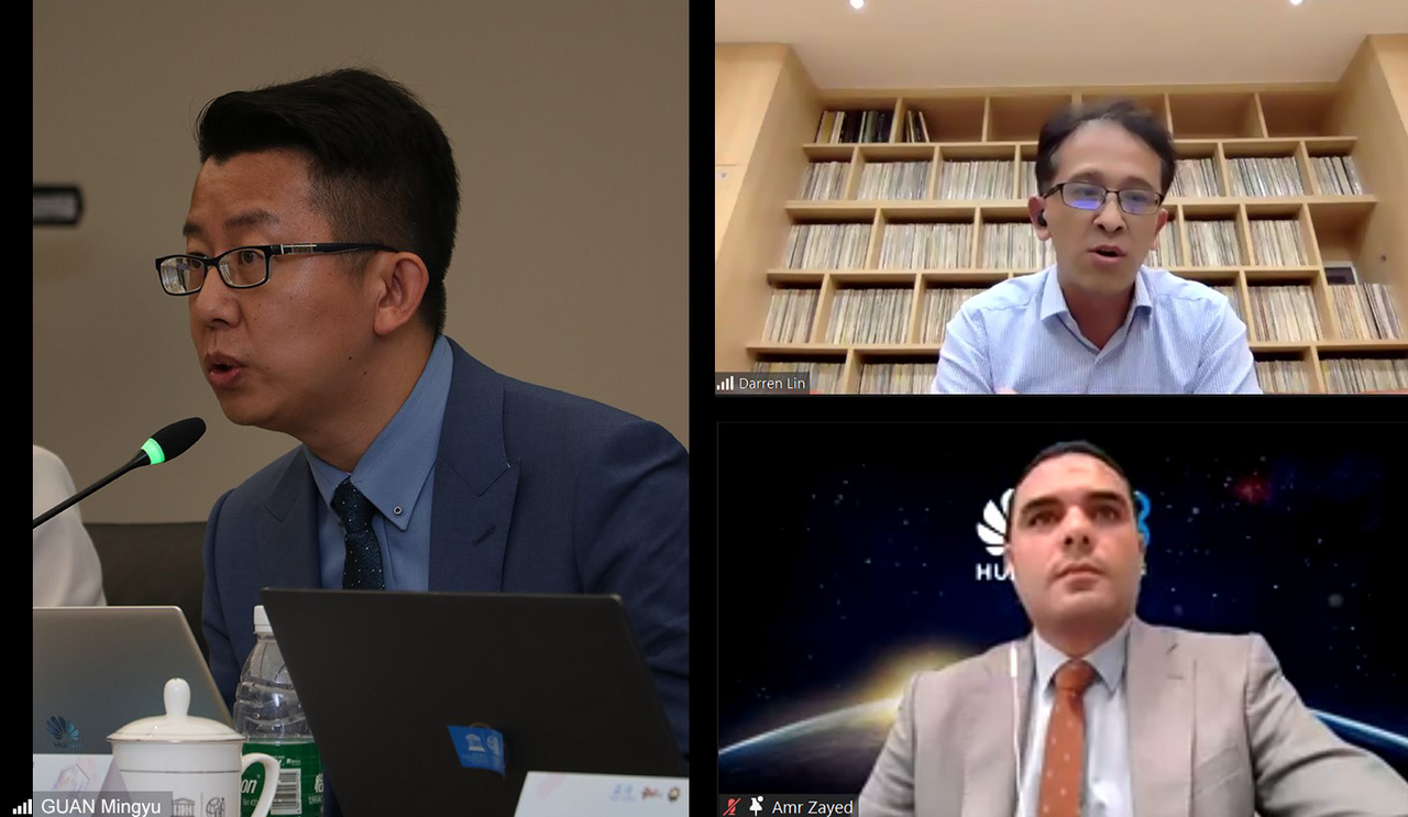 IIOE的合作伙伴企业希沃和华为的代表分别就如何应用自身的技术和资源支持IIOE伙伴院校开展在线混合式高等教育发言。希沃代表林志宏先生介绍了希沃教育信息化的软硬件设备及教师信息化能力培训体系。他表示,希沃愿意与广大发展中国家共享教育信息化解决方案,助力西亚非洲地区高校的数字化转型。华为代表Amr Mohamed Mahrouse Zayed先生、关明宇先生介绍了华为ICT学院和人才生态在埃及和全球的活动。他们表示,华为愿与IIOE一道共同助力发展中国家培养适应时代需要的信息化人才。