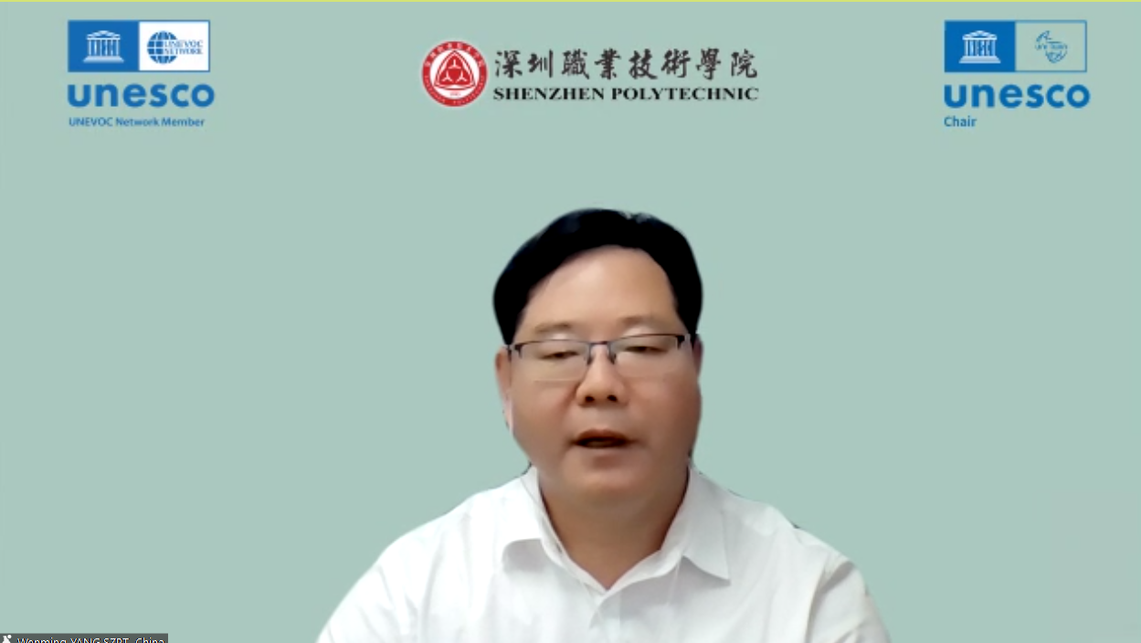 Mr. Yang Wenming, Professor, Coordinator of UNESCO Chair on Digitalization in TVET and UNEVOC Centre at Shenzhen Polytechnic,took the stage to talk about digital competency development for TVET teaching personnel. He highlighted three key aspects: basic digital skills for all teachers, core digital skills for TVET teachers, and specialized digital skills relevant to the TVET sector. He also proposed the future image of TVET teachers as not only teaching and training masters, but also AI and robot assistants.