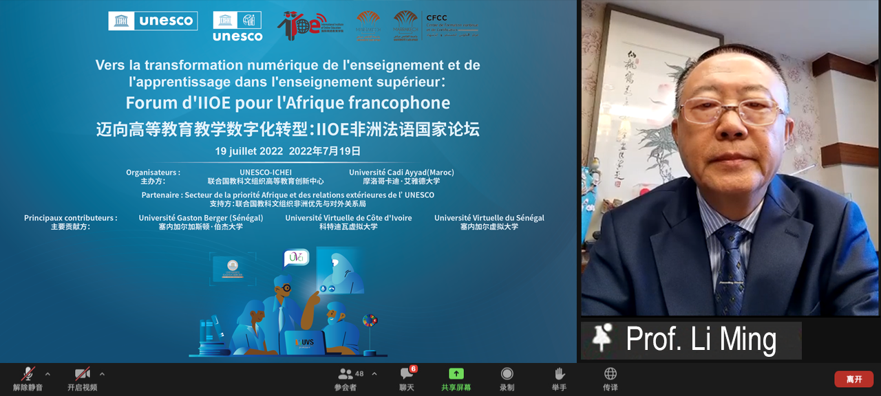 On 19 July 2022,  the International Institute of Online Education (IIOE) forum for Francophone Africa was successfully held, which officially launched the IIOE Activity series for Francophone Africa. With the theme of "Towards the Digital Transformation of Teaching and Learning in Higher Education", the forum was jointly organised by the International Centre for Higher Education Innovation under the auspices of UNESCO (UNESCO-ICHEI) and Cadi Ayyad University (UCA) in Morocco, in partnership with the UNESCO Priority Africa and External Relations Sector. Gaston Berger University in Senegal, the Virtual University of Senegal (UVS) and the Virtual University of Côte d'Ivoire (UVCI) were major contributors. The activity series will take the form of online teacher training and conferences, which is also the first regional activity series organised by UNESCO-ICHEI. More than 60 representatives from higher education institutions (HEIs), governments and UNESCO from 10 countries participated in the forum.