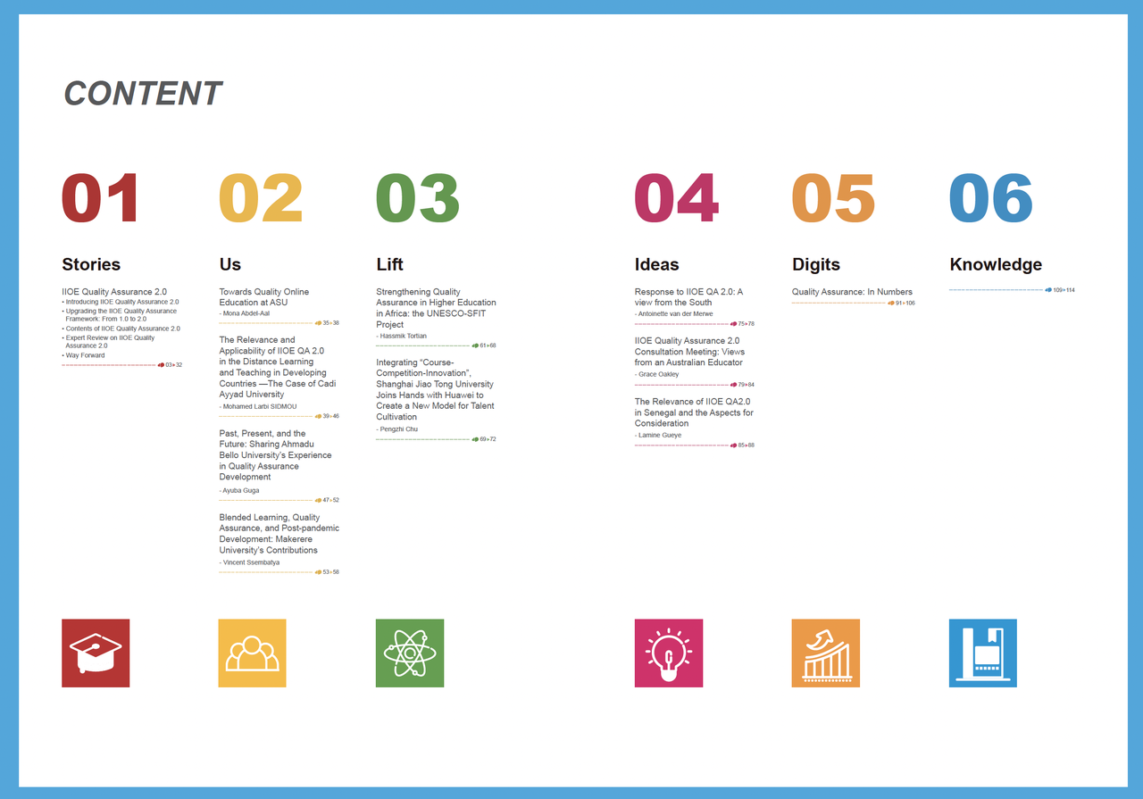 The third issue of CLOUD focuses on Africa and West Asia Region, with the theme of "Back to the Basics: Quality Assurance for the Futures of Higher Education". Based on the outcome of the International Institute of Online Education (IIOE) Partnership Meeting 2021 (Africa and West Asia) and the International Institute of Online Education (IIOE) Quality Assurance 2.0 Consultation Meeting, the third issue focuses on the latest IIOE Quality Assurance 2.0 released by UNESCO-ICHEI, initiating a series of discussions around building, promoting, and supporting an ecosystem of institutions for online and blended teaching and learning (OBTL). The issue also recorded actions and experiences of IIOE's partner HEIs in Africa and West Asia to ensure continuity and quality of higher education during and beyond the COVID-19 pandemic, as well as good practices of how IIOE supported partner HEIs in West Asia and Africa in online and blended higher education and digital transformation.