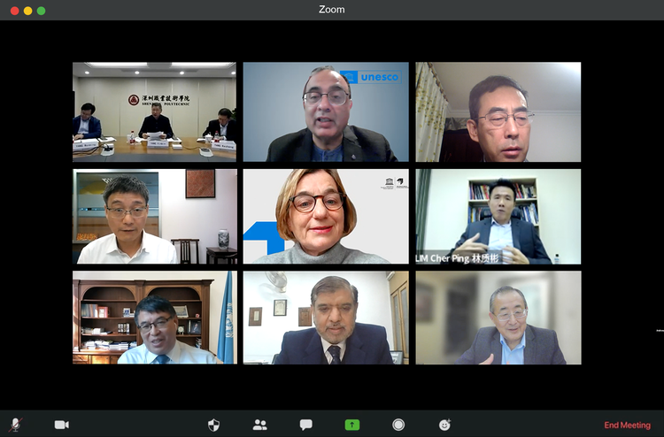 The experts present at this meeting are: TANG Qian, former Assistant Director-General for Education of UNESCO; Shahbaz Khan, director of UNESCO Beijing Office; ZHAN Tao, Director of UNESCO Institute for Information Technologies in Education (IITE); QIN Changwei, Secretary General of the Chinese National Commission for UNESCO;  YANG Xinbin, Chairman of Board and President of Shenzhen Polytechnic; WANG Libing, Chief of Section for Educational Innovation and Skills Development, UNESCO Asia and Pacific Regional Bureau for Education; Michaela Martin, Programme Specialist of the UNESCO International Institute for Educational Planning (IIEP); LIM Cher Ping, Chief Expert of IIOE at UNESCO-ICHEI, Chair Professor of Learning Technologies and Innovation at the Education University of Hong Kong; Waqar Mahmood, Director of AI-Khawarizmi Institute of Computer Science (KICS), University of Engineering and Technology, Lahore (Pakistan); ZHAO Jianhua, Associate Director of the Center for Future Education Research of SUSTech, Senior Expert of UNESCO-ICHEI as well as representatives from ICHEI cooperation information-based enterprises.