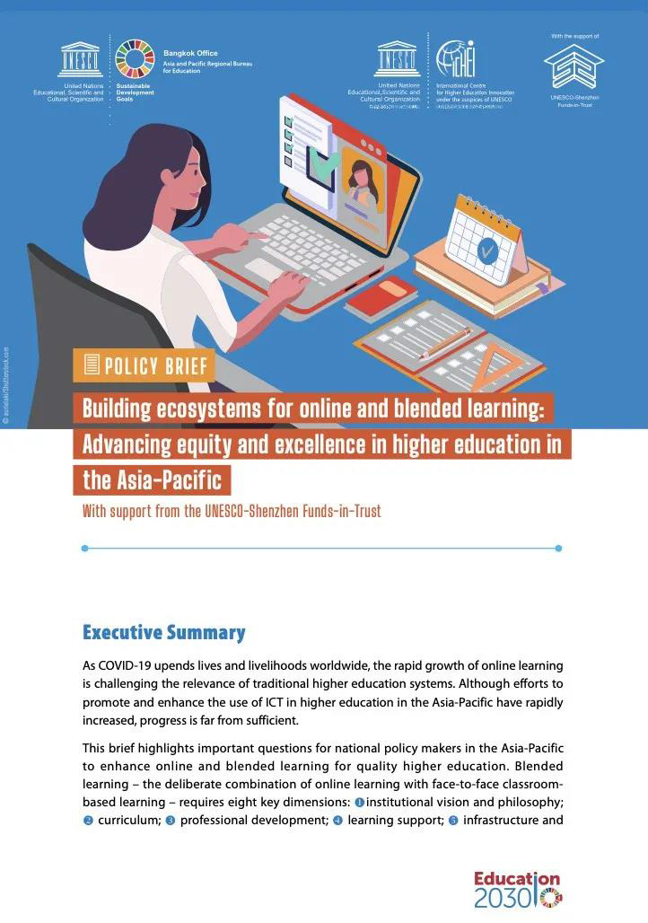 With support from the UNESCO-Shenzhen Funds-in-Trust (UNESCO-SFIT), the policy brief titled Building ecosystems for online and blended learning: Advancing equity and excellence in higher education in the Asia-Pacific (policy brief) is officially released. The policy brief was completed in collaboration with colleagues from the International Centre for Higher Education Innovation under the auspices