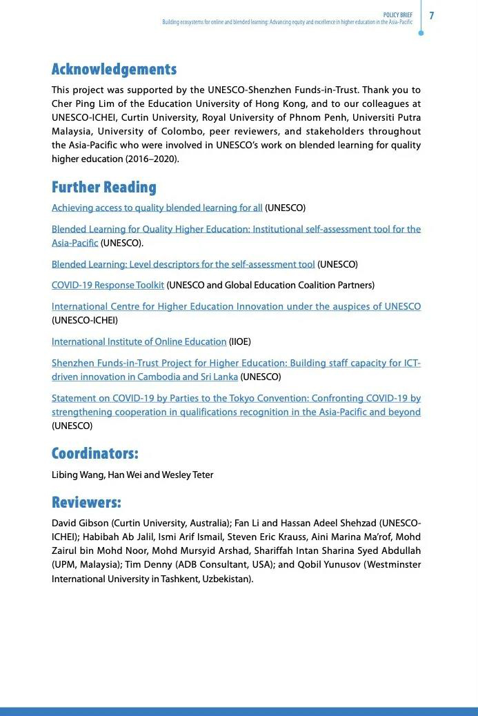 With support from the UNESCO-Shenzhen Funds-in-Trust (UNESCO-SFIT), the policy brief titled Building ecosystems for online and blended learning: Advancing equity and excellence in higher education in the Asia-Pacific (policy brief) is officially released. The policy brief was completed in collaboration with colleagues from the International Centre for Higher Education Innovation under the auspices of UNESCO (UNESCO-ICHEI), UNESCO Bangkok, the Education University of Hong Kong, Curtin University, Royal University of Phnom Penh, Universiti Putra Malaysia and, University of Colombo as well as educational experts and scholars in the Asia-Pacific region.