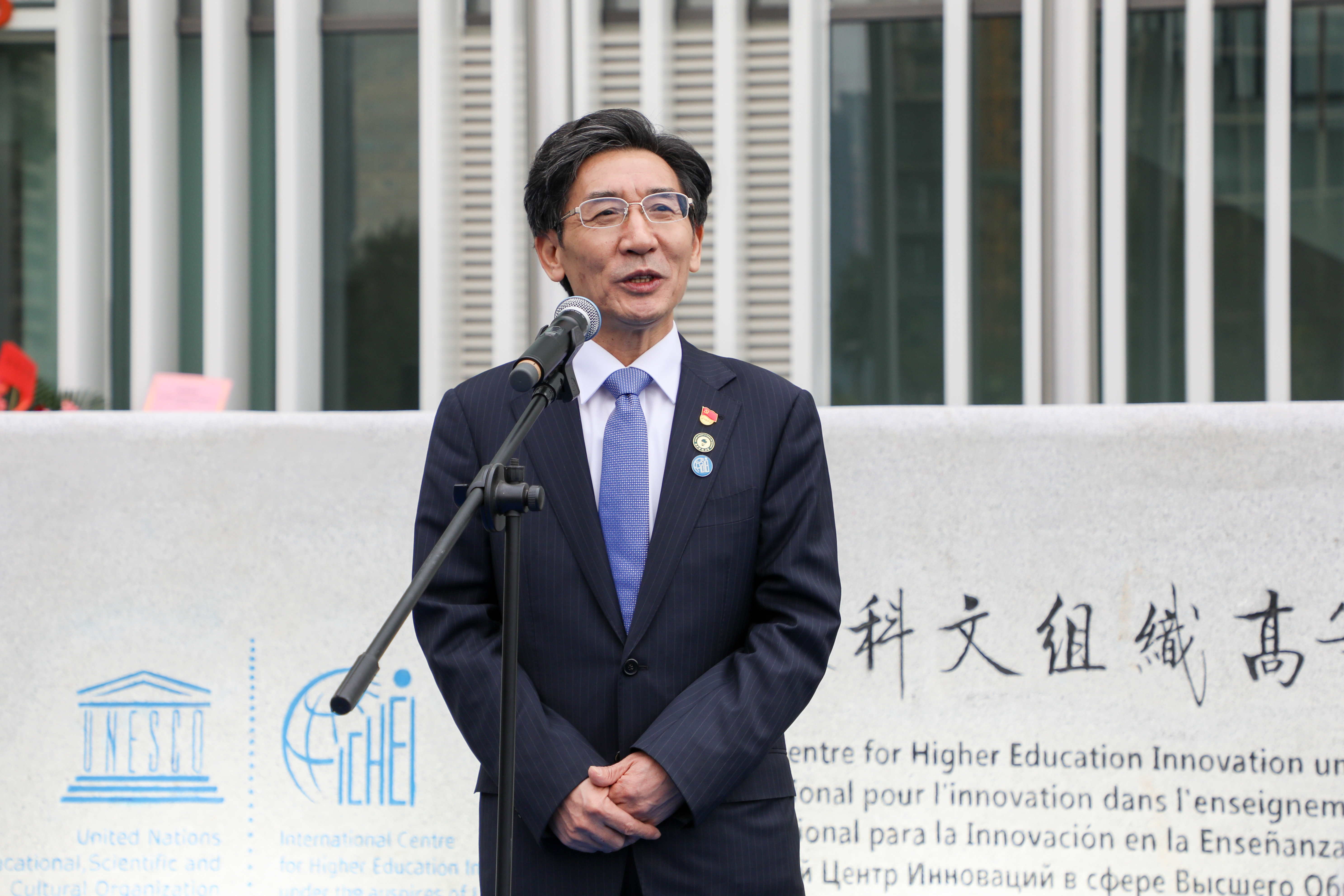Prof. XUE Qikun delivering a speech Prof. XUE Qikun pointed out the inauguration of the inscription stone is the witness for UNESCO-ICHEI' efforts in promoting Shenzhen's globalization and serving the Belt and Road Initiative. He expressed his hope that UNESCO-ICHEI could further expand cultural and educational exchanges and facilitate China's going global in terms of culture and education. In the end, Prof. XUE Qikun delivered his best wishes for the future development of UNESCO-ICHEI.