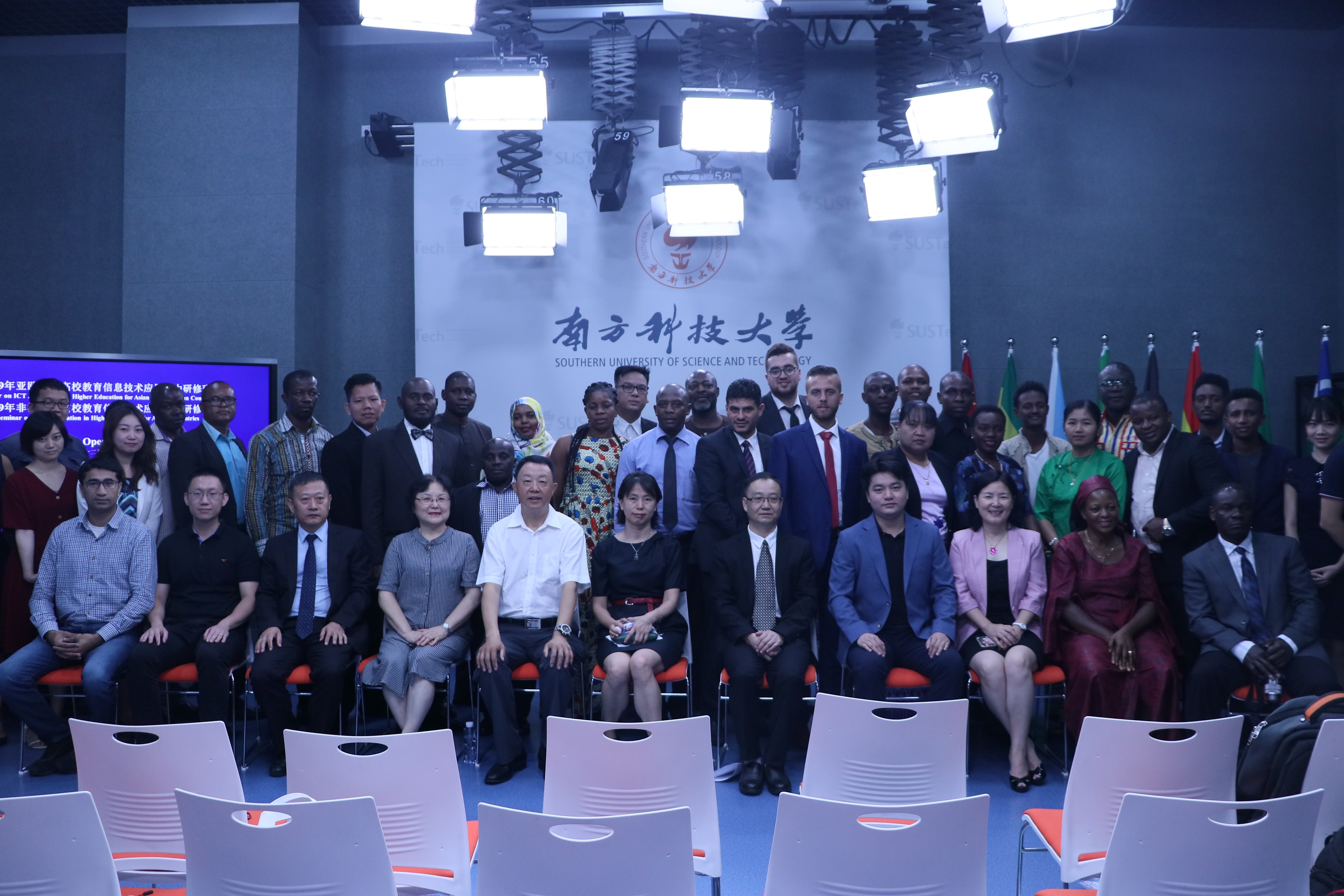 Group photo of participants on SUSTech campus September in Shenzhen is still covered by lush greeneries, with everything full of energy and vitality.On the morning of September 12th, 2019, "Seminar on ICT Application in Higher Education for Asian and European Countries", and "Seminar on ICT Application in Higher Education for African Countries" opened at the MOOC Center, Southern University of Technology and Science (SUSTech). Sponsored by th
